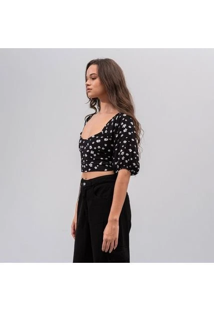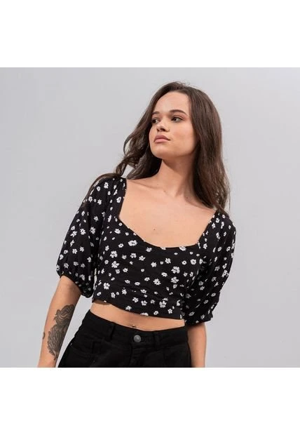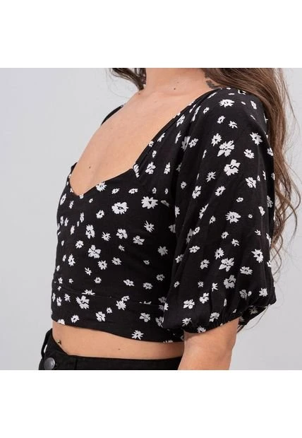 -Blusa Manga Corta Bombacha -Silueta Ajustada -Largo Crop -Escote En V -Espalda Escotada Con Amarre -Tejido Plano Con Caida Estampado Floral -Color Negro Material: VISCOSA 100%