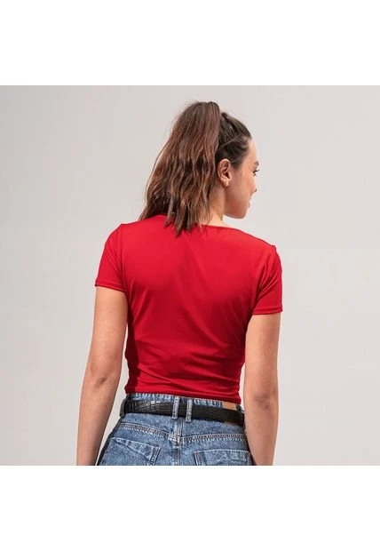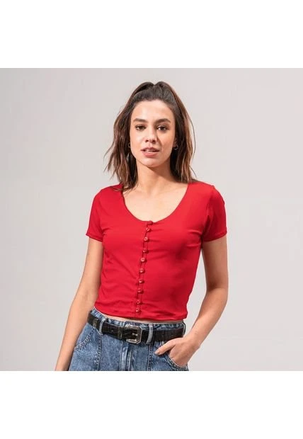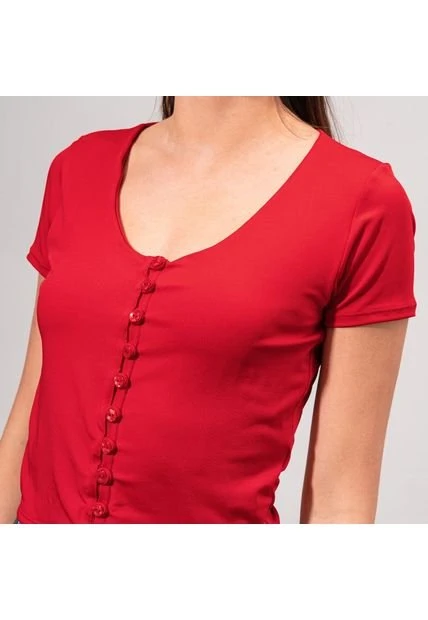 -Blusa manga corta -Largo medio -Silueta ajustada -Cuello redondo -Frente con botones -Tejido de punto con elongacion -Color rojo Material: 96% Poliéster 4% Spandex