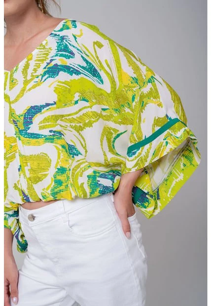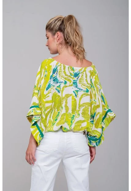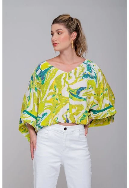 Blusa estampada para mujer con elástico en cintura y manga murciélago tres cuartos con detalle de hiladilla en contraste, cuello en V, silueta amplia Ideal para usar en ocasiones como grados, brunch, o reuniones con amigas y familiares Atrévete a usar prendas coloridas durante el día.