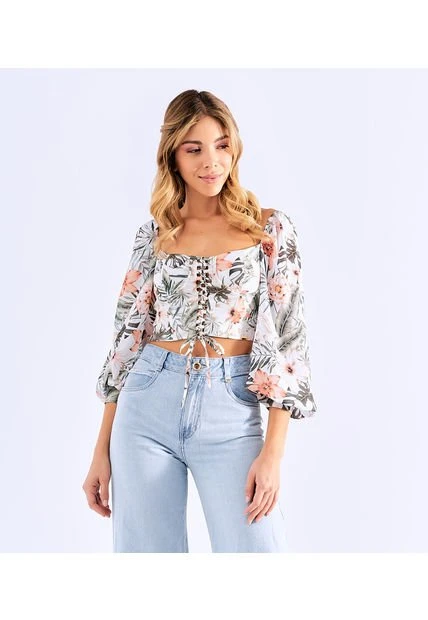 Descripción del producto: Blusa para mujer, tipo corse diseño con sistema de cordon ajustable en centro delantero, manga larga con puños anchos en ruedo. Elaborada en textiles con delicada caída y diseño textil floral. Derek