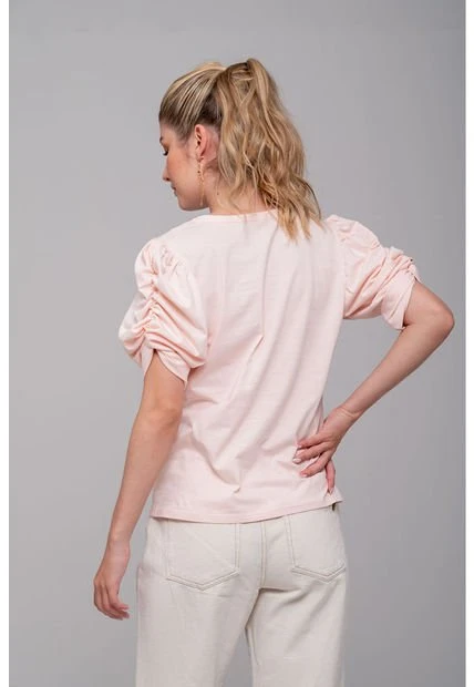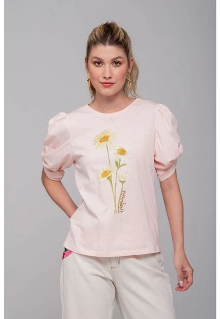 Camiseta estampada para mujer con cuello redondo, manga corta estilo puff enresortada y anudada. Estampado con toques de bordado y pedrería. Silueta semi ajustada. Úsala con tus jeans favoritos.