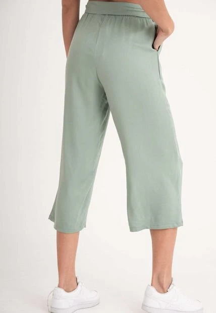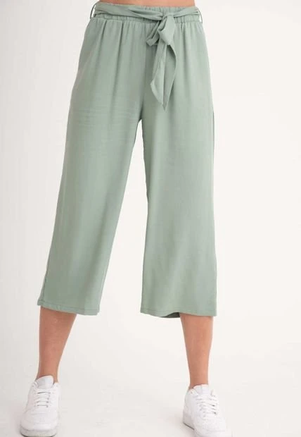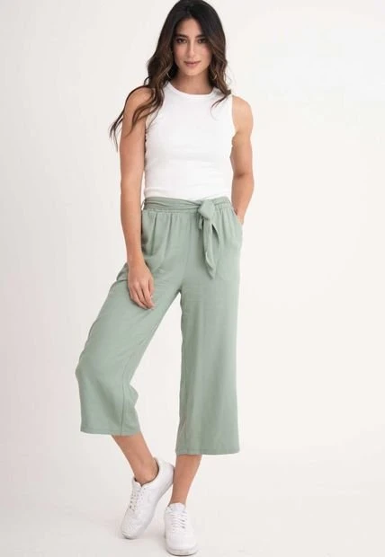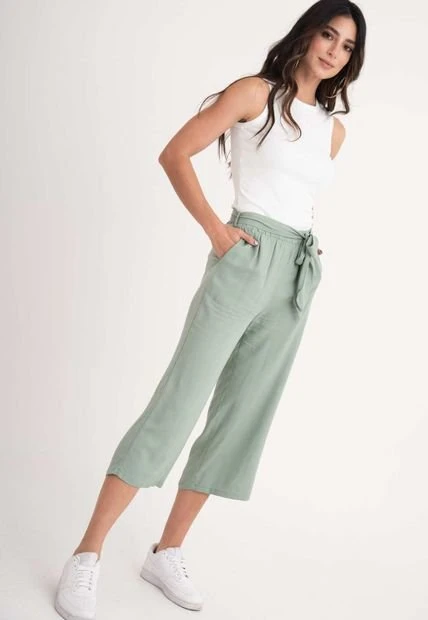Culotte en chalis fondo entero, pretina resortada, pasadore en laterales cintura, cinturón, bolsillos laterales, largo culotte, silueta semi-ajustada.