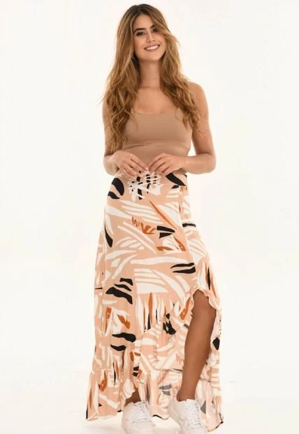Falda en chalis estampado, bolero en ruedo con abertura en costado, ajuste en cintura y cadera, cierre lateral.
