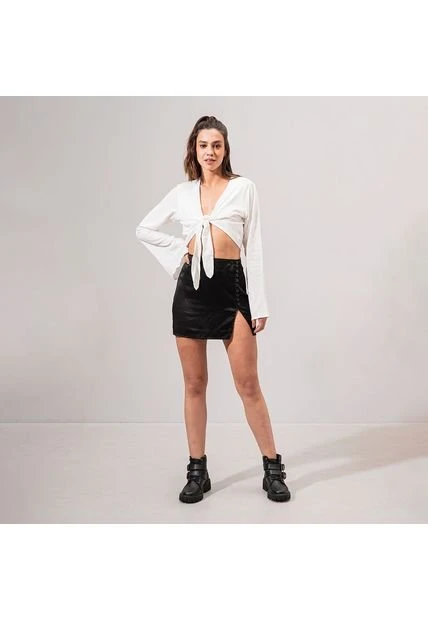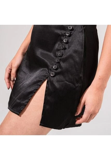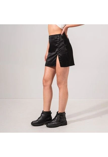 -Falda corta talle alto -Silueta semiajustada -Frente con abertura lateral y botones -Tejido plano con caida -Color Negro Material: 50% Rayón 50% Poliéster