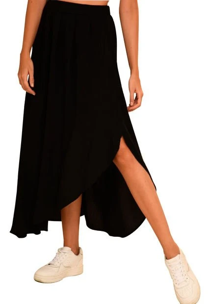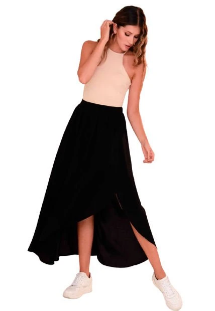 Falda larga en chalis fondo entero, pretina resortada en espalda, corte asimétrico y tablas decorativas, ajuste en cintura, silueta fluida.