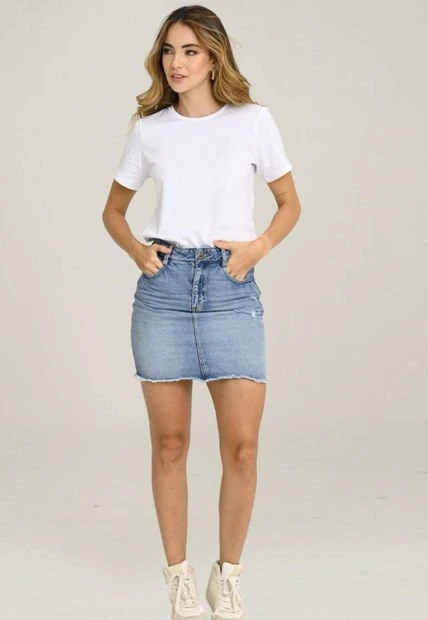 Falda corta en denim fondo entero con proceso de lavado y desgaste, pretina con pasadores y botón, cierre frontal, cinco bolsillos. RAGGED es una empresa competitiva y sólida que cuenta con más de 30 años de experiencia con su propuesta de diseño y moda,