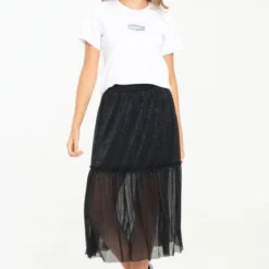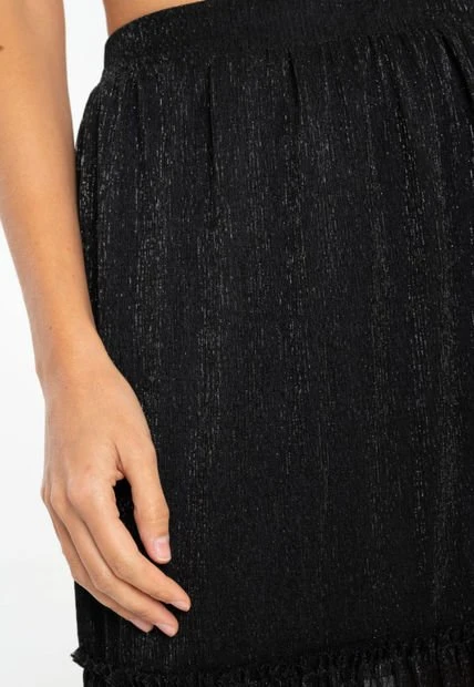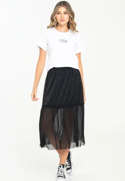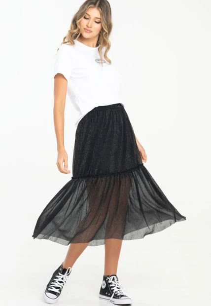 Falda midi en mesh con lurex, pretina con elástico, forrada, linea A con corte y ruche decorativo. RAGGED es una empresa competitiva y sólida que cuenta con más de 30 años de experiencia con su propuesta de diseño y moda,