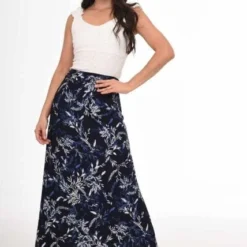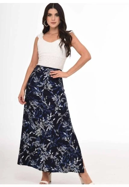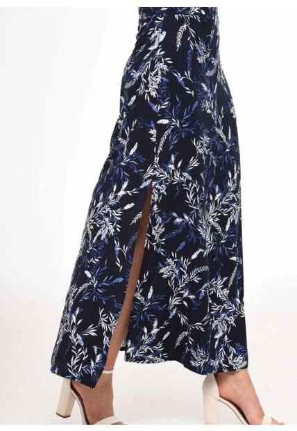 Falda larga en chalis estampado, tiro alto, cierre lateral, aberturas laterales.