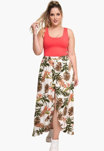 Falda larga en chalis estampado, pretina resortada con sesgo de amarre decorativo, bolero en ruedo asimétrico.