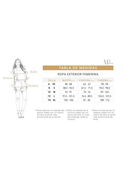 - Te recomendamos consultar la tabla de medidas para que escojas la talla correcta.
