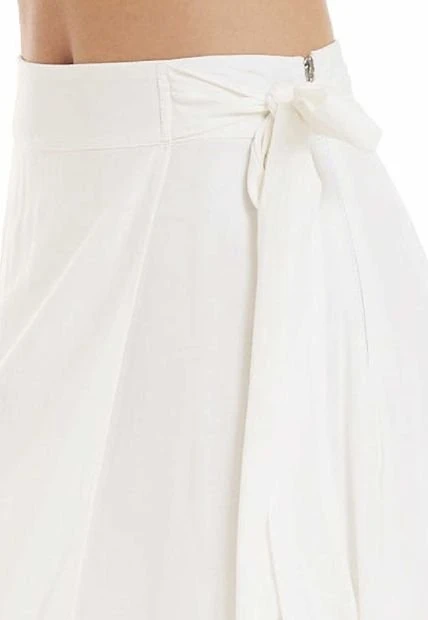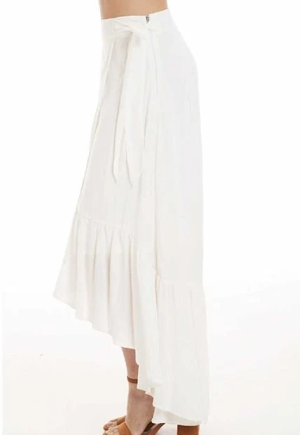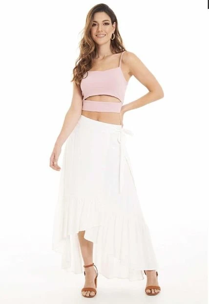 Falda larga en chalís fondo entero, pretina sencilla con tiras que anudan en el costado izquierdo, capas sobrepuestas en delantero, bolero en ruedo, silueta semi ajustada.