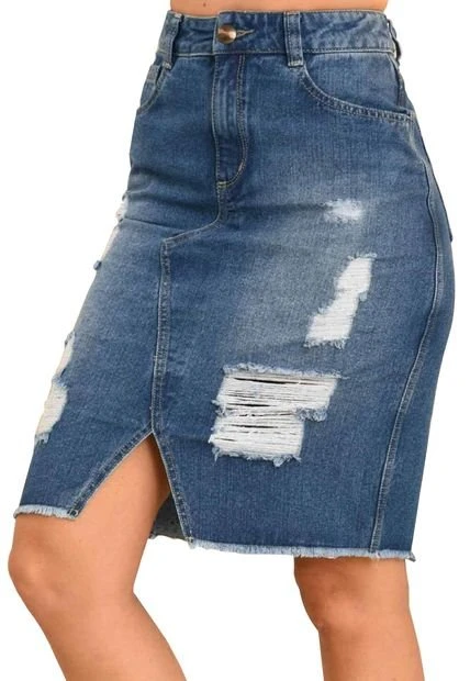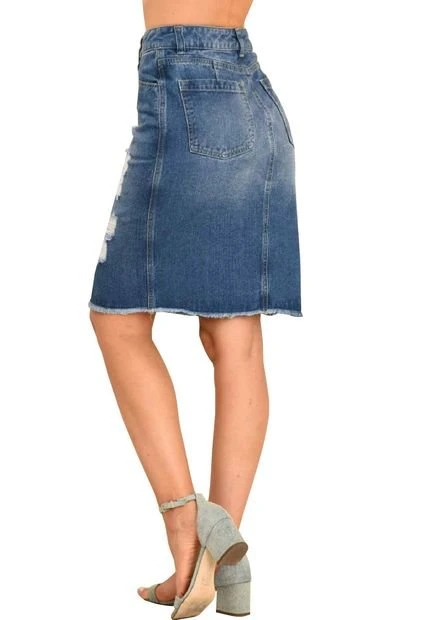 Falda corta en denim fondo entero con proceso de lavado y desgaste, cierre frontal, cinco bolsillos, ruedo al corte.