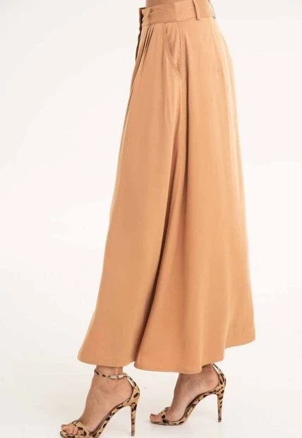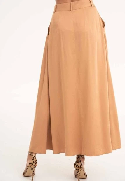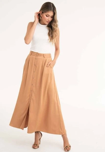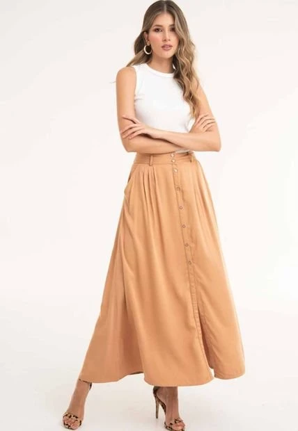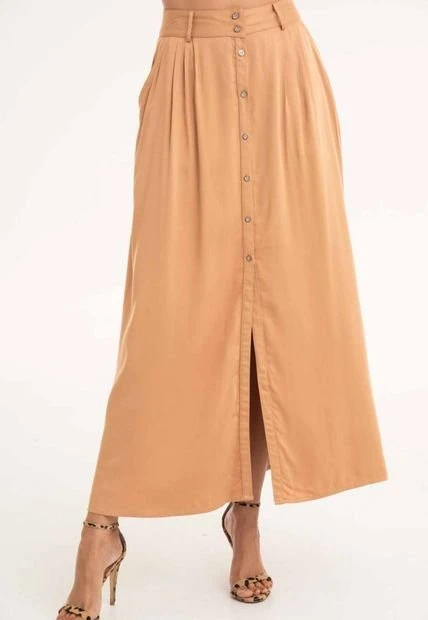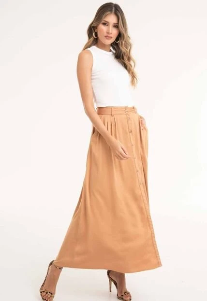 Falda larga en chalis fondo entero, botones en centro frente, bolsillos laterales.