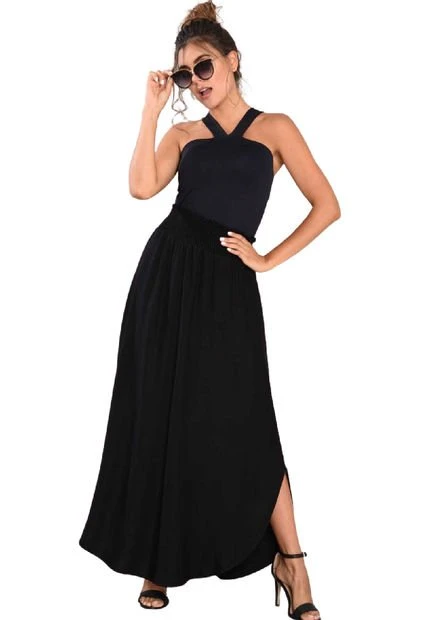 Falda larga en chalis fondo entero, pretina resortada, corte asimétrico en ruedo, forrada en chalis fondo entero.