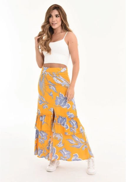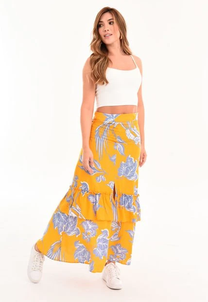 Falda larga en chalís estampado, abertura en centro frente y boleros en ruedo, ajusta en cintura y cadera. RAGGED es una empresa competitiva y sólida que cuenta con más de 30 años de experiencia con su propuesta de diseño y moda,