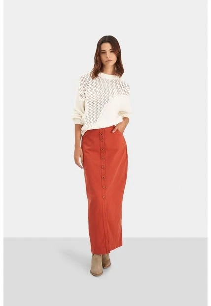 Inspirada en la clásica falda en denim, esta pieza de largo midi otorga sofisticación al mundo casual, dándole mucha versatilidad y convirtiéndose en un infaltable en el armario femenino. Su diseño tiro alto de silueta ajustada se complementa con su botonadura en frente y sus bolsillos delanteros y posteriores, haciéndola ideal para usar con tenis, sandalias de tacón o botines, generando looks casuales para todos los climas.
