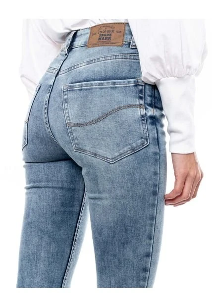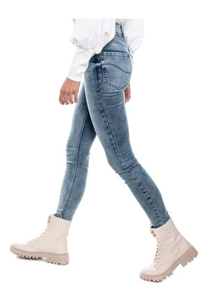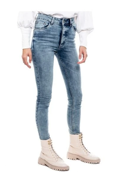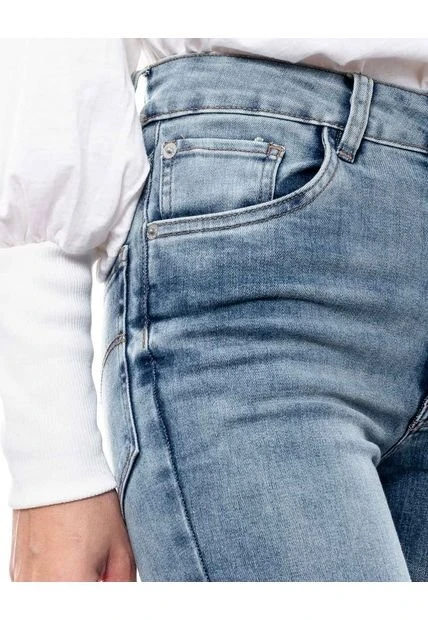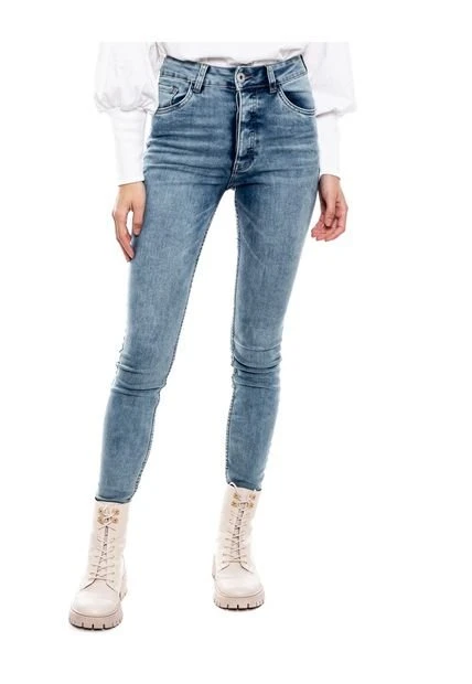 High waist skinny jeans con efecto cross lavado todo medio. Esta prenda está hecha con el corazón por manos Colombianas.