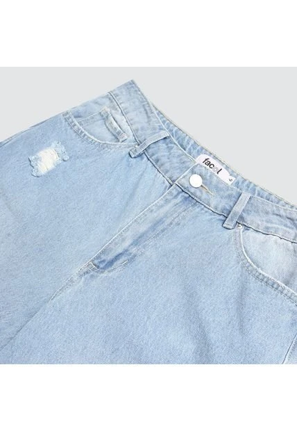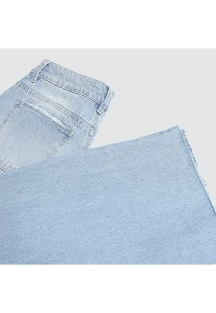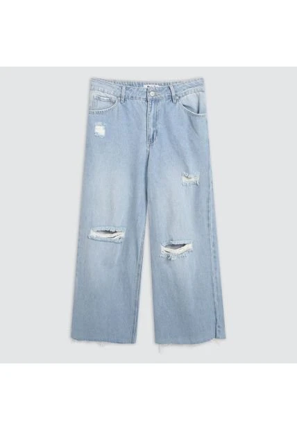 Jean para Mujer culotte tono azul claro con rotos. Jean cinco bolsillos con cremallera delantera y botón metálico. No dejar en remojo, lavar en agua fría separadamente, no usar blanqueador, no retorcer, secar a la sombra. Plancha tibia.