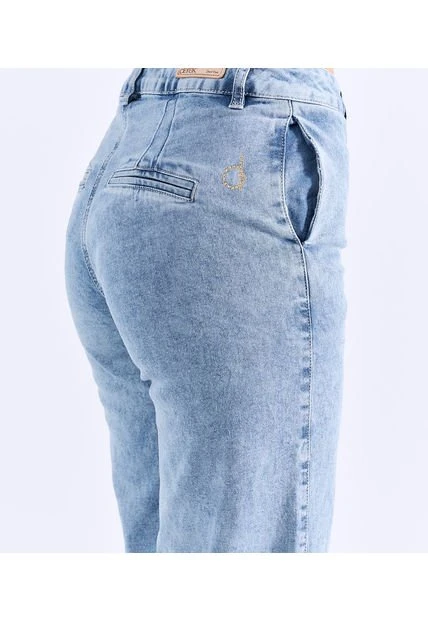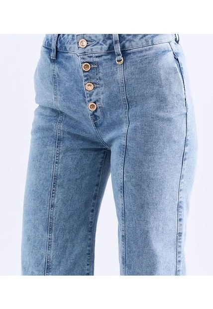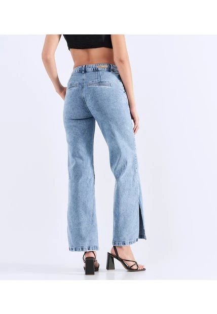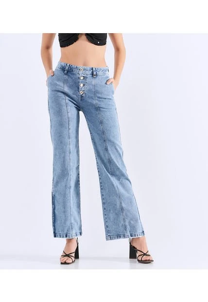 Descripción del producto: jean para mujer tiro alto, con botonera, bota amplia, diseño con cortes en delantero, bolsillos traseros en ribetes y proceso claro derek