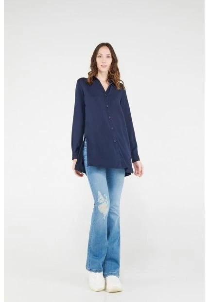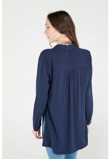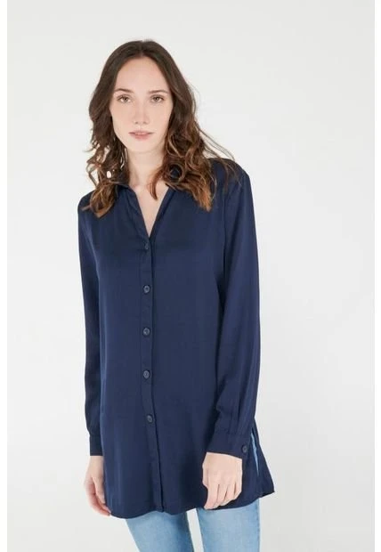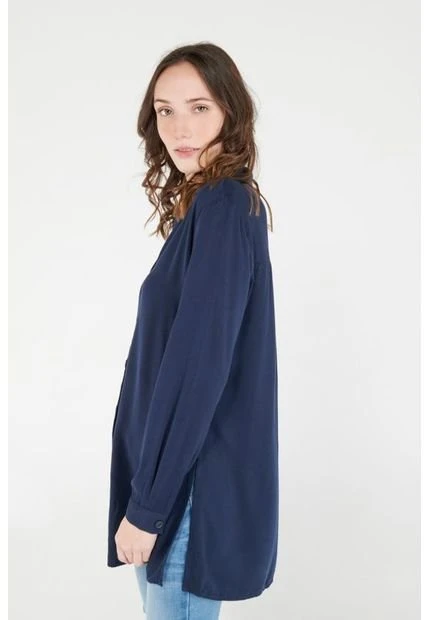 Blusa en tela fluida, unicolor, cuello camisero, abertura en costados