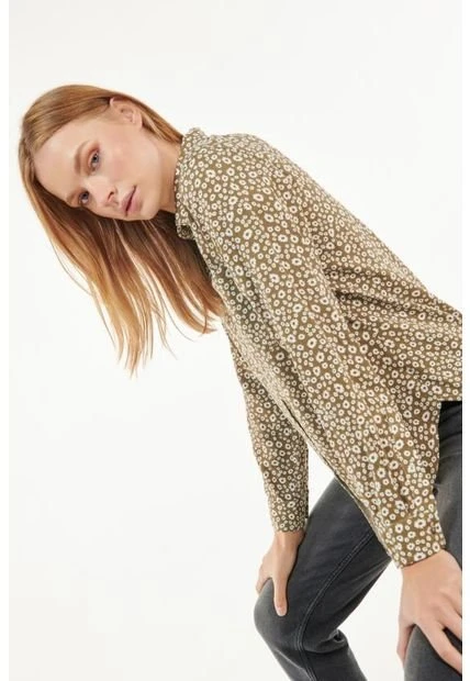 Blusa manga larga verde oscura para mujer, elaborada en tela viscosa y con un fit ceñido al cuerpo, tiene estampados de flores blancas, cuello camisero, cierre con botones en frente y borde inferior asimétrico. Lúcela con un jean jegging y unos botines, será la combinación perfecta para crear un outfit arriesgado con el que te destaques.