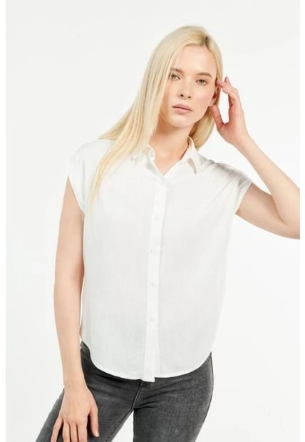 Blusa en tela fluida unicolor, manga corta cuello camisero con botonadura en el frente.