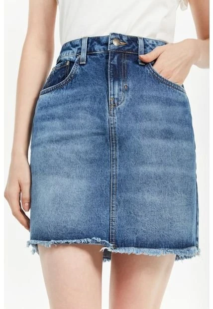 Falda de jean para mujer, 5 bolsillos, tiro alto, con proceso de lavado y corte navaja.