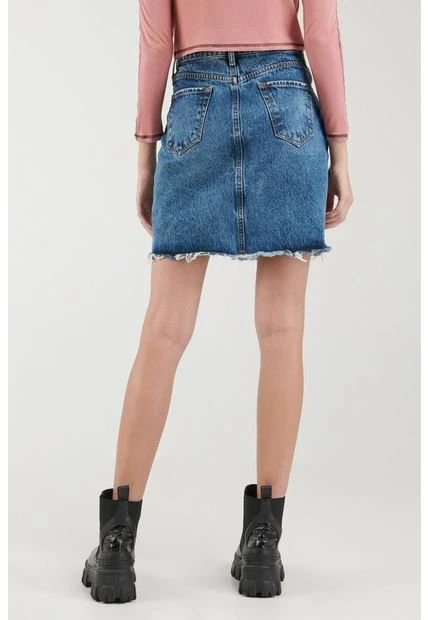 Falda de jean para mujer, 5 bolsillos, tiro alto, con proceso de lavado y corte navaja.
