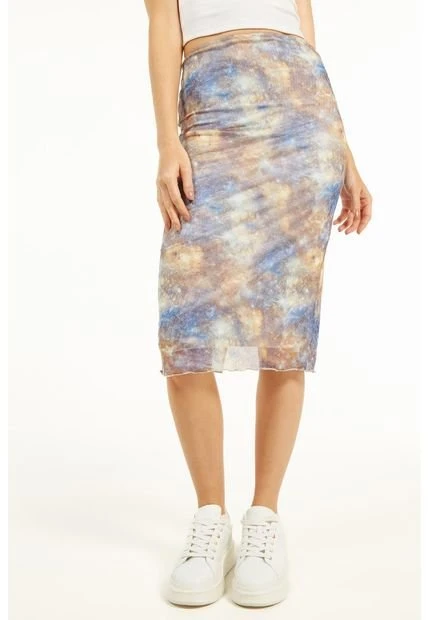 Falda azul clara con efecto tie dye para mujer cuenta con una elaboración en tela de malla, una abertura posterior, una silueta corta y una horma ceñida al cuerpo. ¡Crea el outfit de tus sueños con esta prenda! Combínala con una blusa manga sisa y luce radiante en todo momento y lugar.