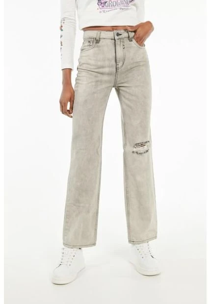 Jean para mujer, 5 bolsillos, tiro alto, lavado con rotos color gris.