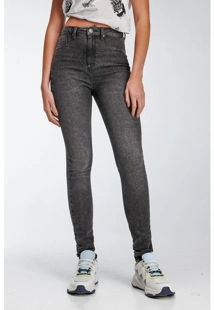Jean para mujer, 5 bolsillos, tiro super alto, ajuste ceñido con lavado gris.