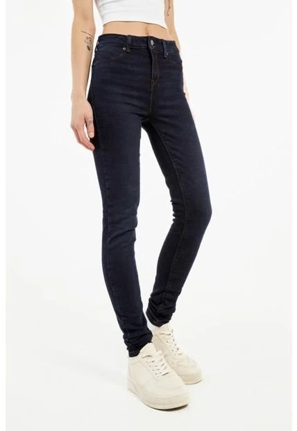 Jean para mujer, 5 bolsillos, tiro alto, ajuste ceñido con lavado azul oscuro.
