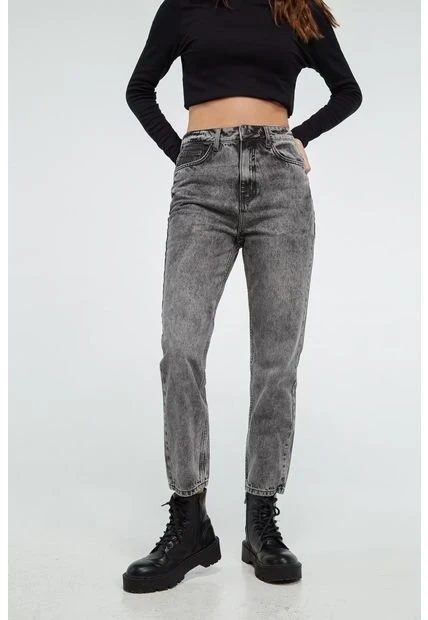 Jean mom fit para mujer, 5 bolsillos, super tiro alto, con proceso gris