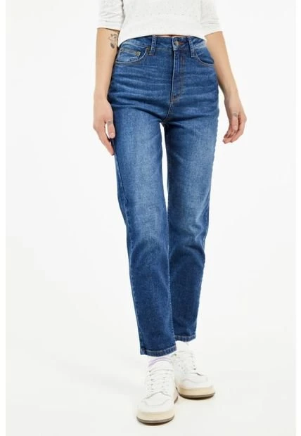 Jean mom para mujer en tono azul oscuro cuenta con tiro súper alto, detalles con costuras amarillas, 5 bolsillos, efectos con desgastes de color, botas rectas y un fit holgado al cuerpo. Esta es una prenda esencial que debes tener en tu clóset, combínalo con un buzo con capota y luce fantástica en tus salidas con amigas.