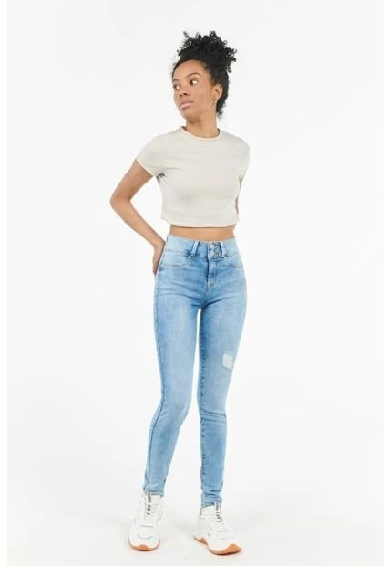 Jean para mujer, 5 bolsillos, tiro medio, pretina ancha de doble botón, efecto push up con lavado azul claro.
