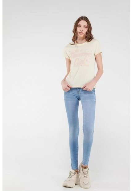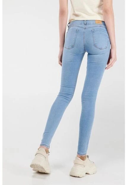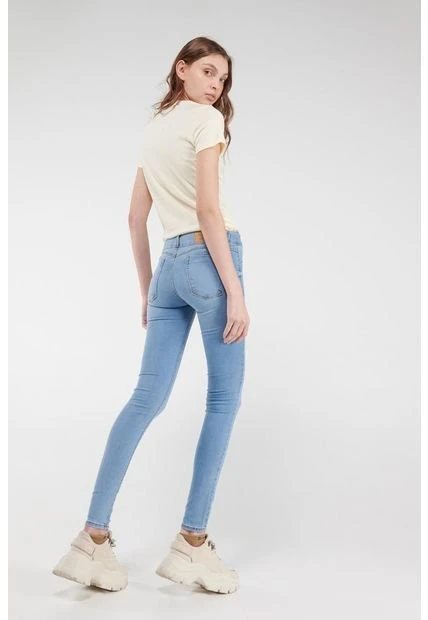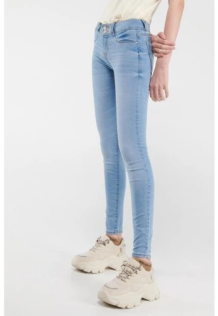 Jean para mujer, 5 bolsillos, tiro medio, pretina ancha de doble botón, efecto push up con lavado claro