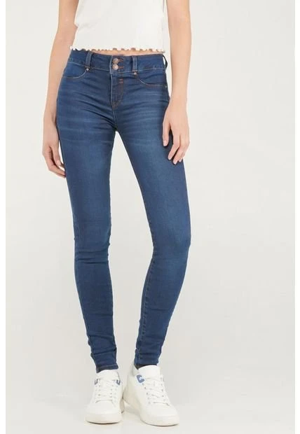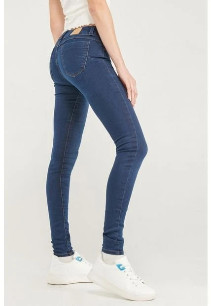 Jean para mujer, 5 bolsillos, tiro medio, pretina ancha de doble botón, efecto push up con lavado oscuro