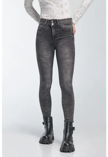 Jean para mujer, 5 bolsillos, tiro alto, pretina ancha de doble botón, efecto push up con lavado gris.