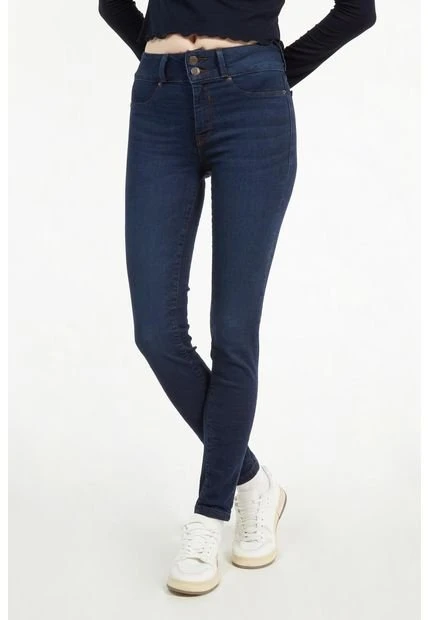 Jean para mujer, 5 bolsillos, tiro alto, pretina ancha de doble botón, efecto push up con lavado azul intenso sin rotos