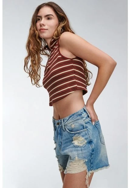 Short para mujer, 5 bolsillos, tiro alto, con rotos, proceso de lavado, y proceso laser.