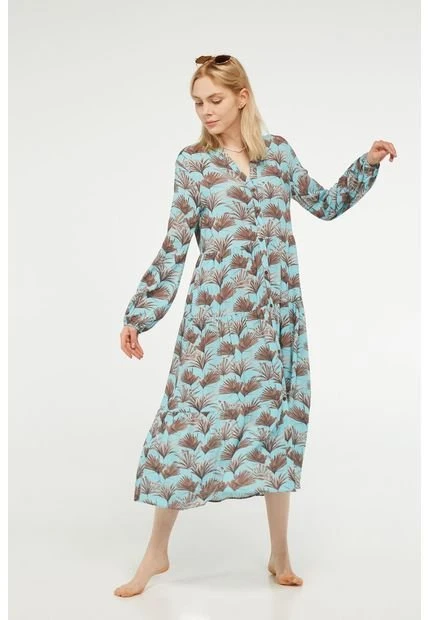 Vestido larg en rayon 100%, manga corta con pechera de botonadura y recogido en cortes de falda,