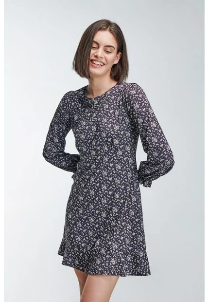 Vestido manga larga, estampado, en tela fluida y arandela en puño.