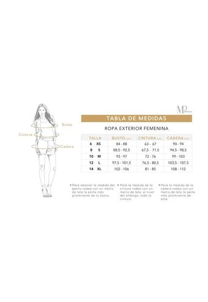 - Te recomendamos consultar la tabla de medidas para que escojas la talla correcta.