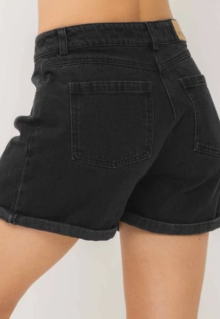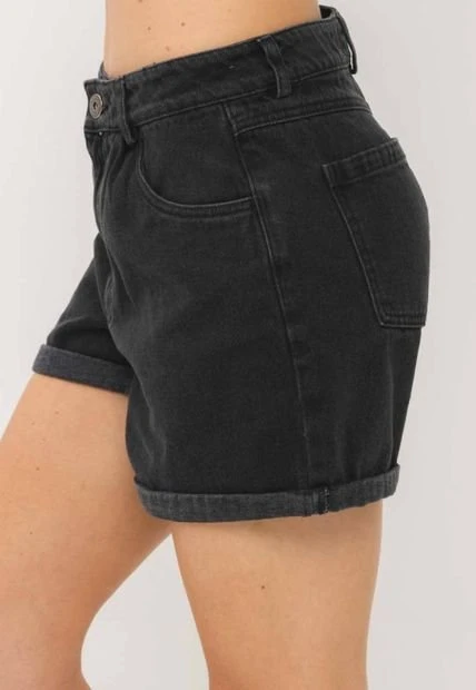 Short fit slouchy en denim negro, cremallera interna con botón metalico de ajuste, pinzas decorativas, 5 bolsillos, guardapolvo en ruedo.