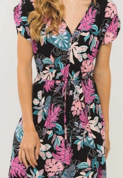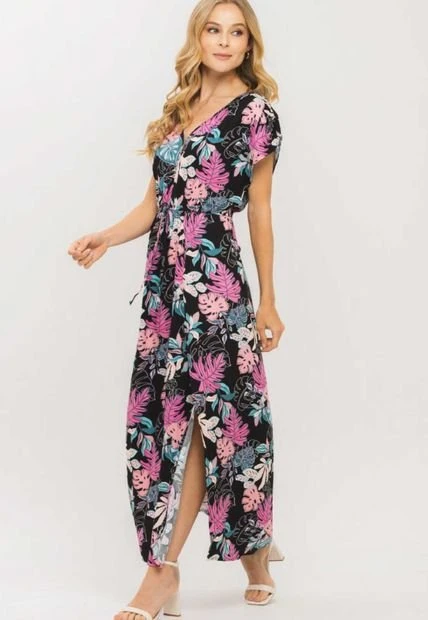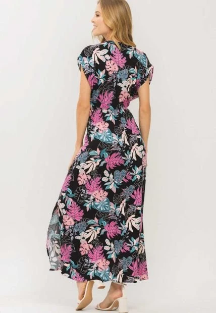 Vestido en chalis estampado, escote en v, manga rodada, elástico y sesgo en cintura, aberturas laterales, falda larga.