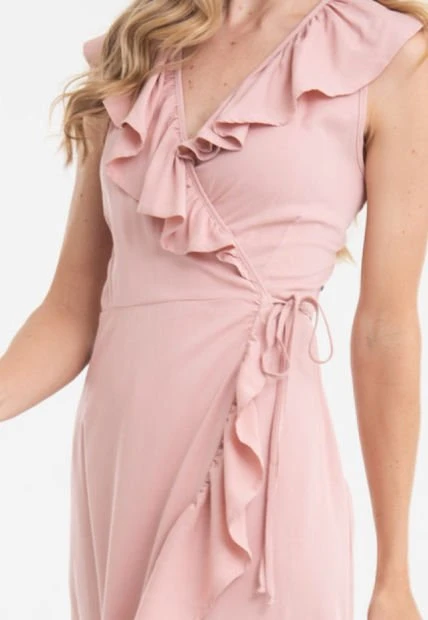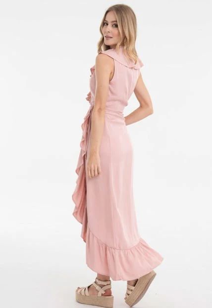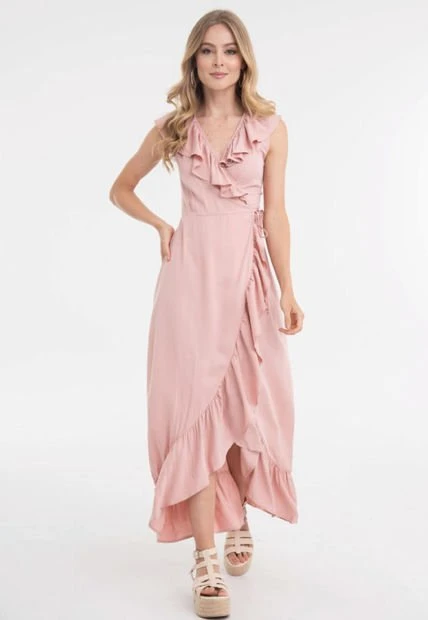 Vestido largo en chalis fondo entero, cruzado con boleros decorativos, manga sisa, amarre lateral, ajusta en cintura.