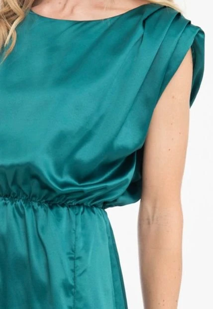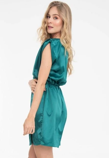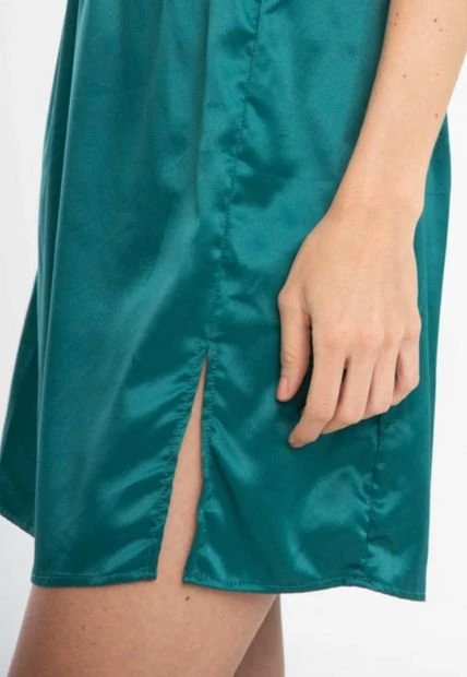 Vestido corto en satin fondo entero, cuello redondo con abertura, manga corta rodada con detalle de prenses en el hombro, abertura en la parte delantera, silueta semi ajustada.