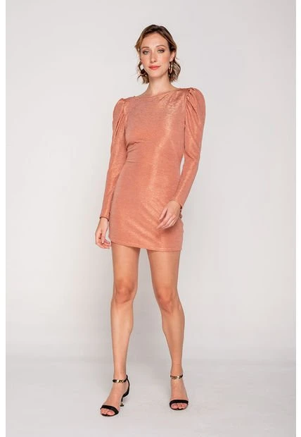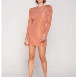 Vestido para mujer corto brillante, con escote redondo, mangas largas tipo puff en parte superior y ajustadas en puño. Silueta ajustada. Este vestido es ideal para una ocasión especial. Con unas sandalias de tiras y un bolso de mano, tendrás un look fenomenal.