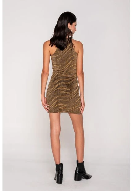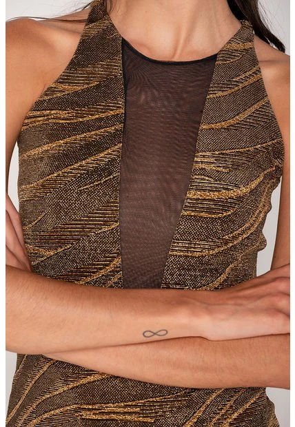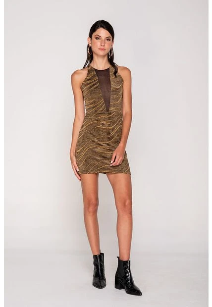 Vestido para mujer corto con escote profundo en mesh y cuello halter, silueta ajustada con tela brillante. Una prenda ideal para una ocasión especial. Úsalo con accesorios que sean de la misma tonalidad, ¡Lucirás maravillosa!