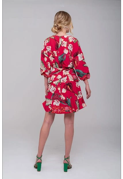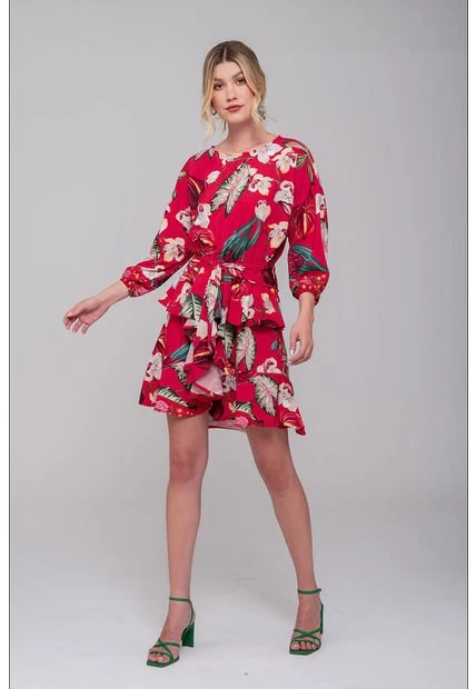 Vestido corto estampado para mujer con cuello en forma de ojal que ajusta en parte posterior por medio de botonadura. Este vestido viene enresortado en cintura, falda con doble bolero y fajon que amarra en parte delantera. Mangas tres cuartos con cenefa estampada en el borde. Un prenda femenina que te hará lucir especial en cualquier ocasión.
